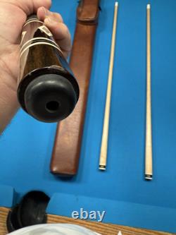 He and his son Scott Erwin made these cues together. This is a 1 of 1 cue. Absolutely beautiful, comes with 2 shafts and a brown leather Joe Porper Classic 1x2 case. There is 1 small clear coat chip at the bottom as shown in the pics.